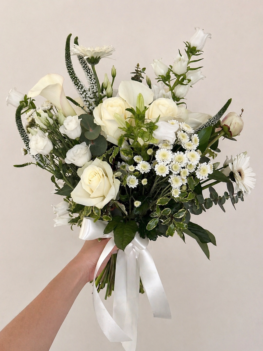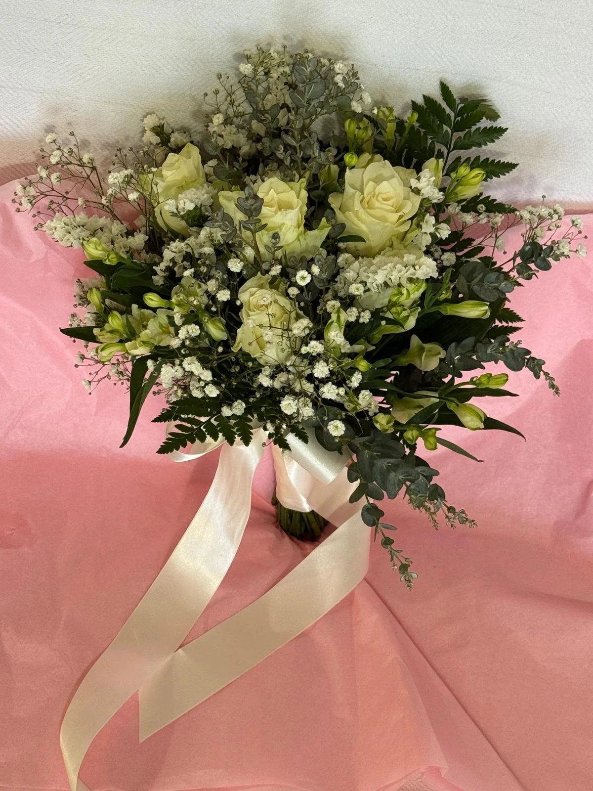 A hand-tied bouquet is a naturally styled arrangement that captures a relaxed, effortless beauty. Flowers and foliage are loosely gathered and bound together by hand, allowing each stem to fall organically into place. This creates a soft, slightly unstructured shape, often with varied heights and textures that give the bouquet a fresh, just-picked feel.