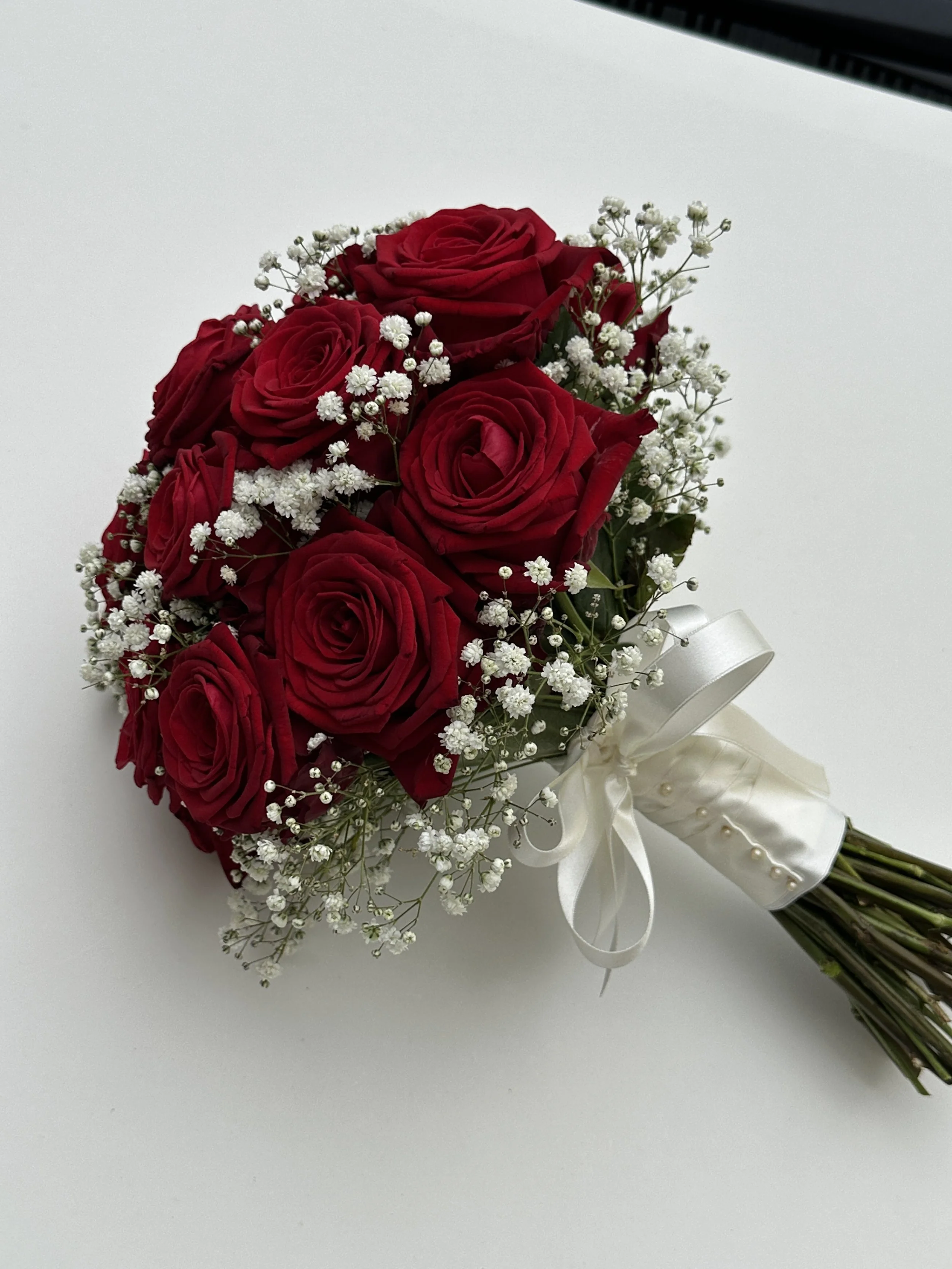 A nosegay bouquet is a small, compact arrangement of closely gathered blooms, finished with a neatly wrapped handle for a clean, elegant look. Its lightweight size makes it perfect for bridesmaids and flower girls, offering a delicate and coordinated touch without being too heavy or overwhelming.